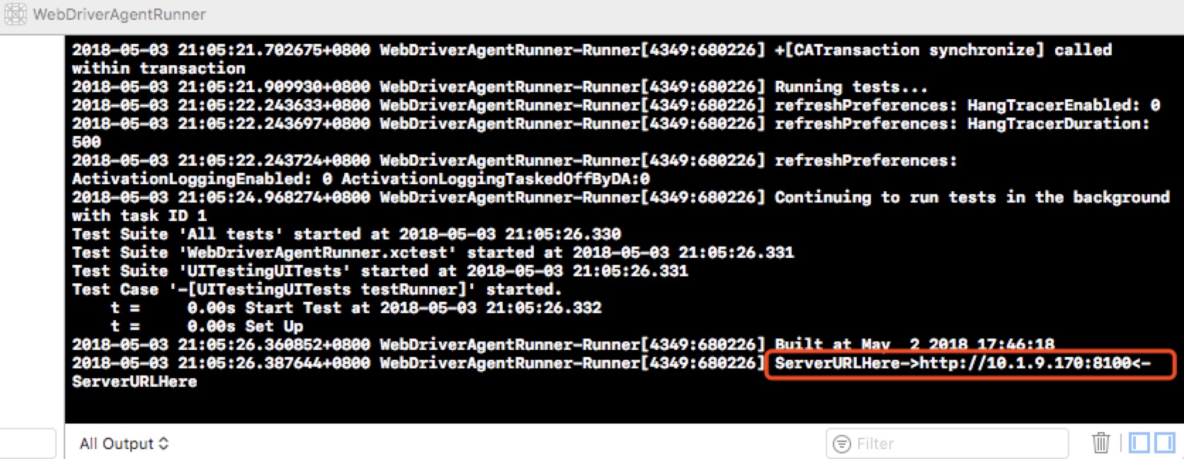 Cmd+U即可顺利运行。运行成功后即可以在Xcode控制台打印出一个ip地址和端口号,具体如下图所示: